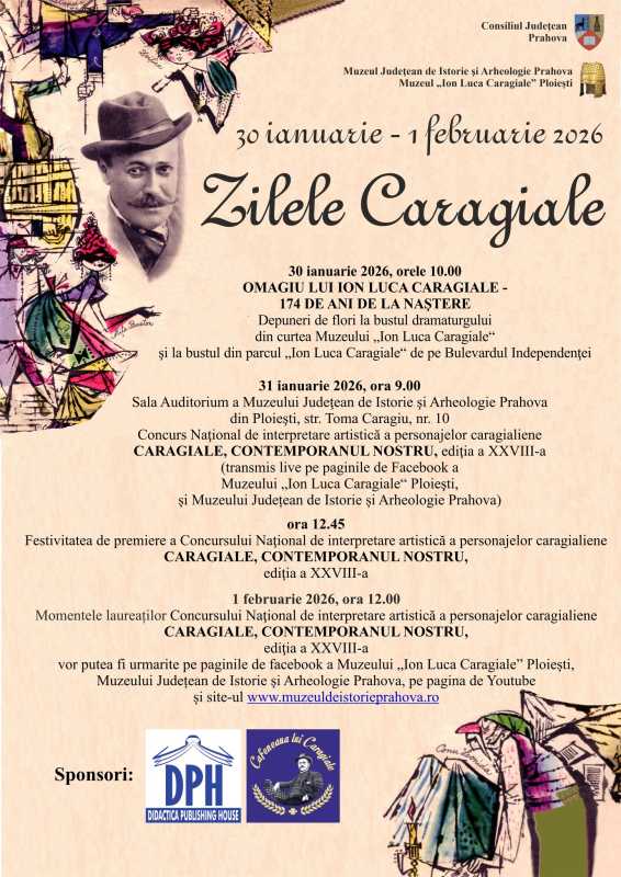 *Finala Concursului Național de interpretare artistică a personajelor caragialiene - 'Caragiale, contemporanul nostru' - are loc în perioada 31 ianuarie - 1 februarie 2026, la Muzeul ''Ion Luca Caragiale'' din Ploiești. Ajuns la XXVIII-a ediție, concursul, organizat în preajma zilei de naștere a marelui dram