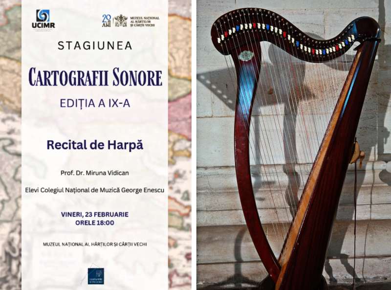 * Vineri, 23 februarie, de la orele 18.00, la Muzeul Hărţilor din Bucureşti are loc un recital inedit de harpă, inclus în stagiunea "Cartografii sonore. Concertele MNHCV" ediţia a IX-a, susţinut de doamna profesor dr. Miruna Vidican şi elevi ai Colegiului Naţional de Muzică "George Enescu". Proiectul "Cartografii