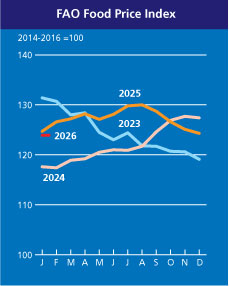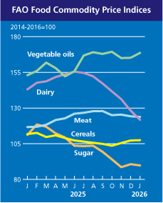 FAO publică lunar propriul său Food Price Index, care măsoară modificările de prețuri înregistrate la un coș de alimente format din: cereale, uleiuri vegetale, lactate, carne și zahăr.