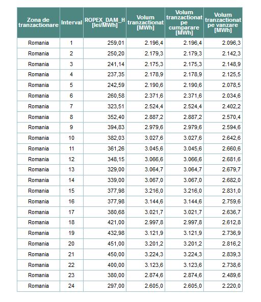 Spre comparaţie, la începutul lunii august, preţul mediu era de 166 de lei pe MWh, în iulie - 170 de lei, în iunie - 258 de lei, în mai - 112 lei, în aprilie - 63 de lei, în martie - 221 de lei, în februarie - 215 lei, iar la începutul lunii ianuarie de 162 de lei pe MWh.