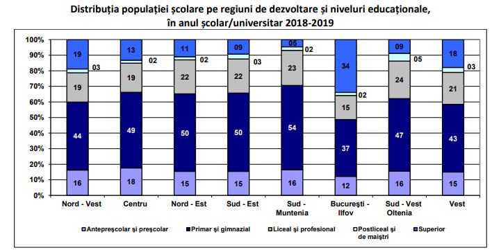 Distribuţia populaţiei şcolare pe regiuni de dezvoltare şi niveluri educaţionale faţă de totalul fiecărei regiuni arată că ponderea cea mai ridicată s-a înregistrat în învăţământul primar şi gimnazial din regiunea Sud-Muntenia (54,2%), în timp ce învăţământul superior a fost preponderent în regiunea Bucureşti-Ilfov (33,9%).