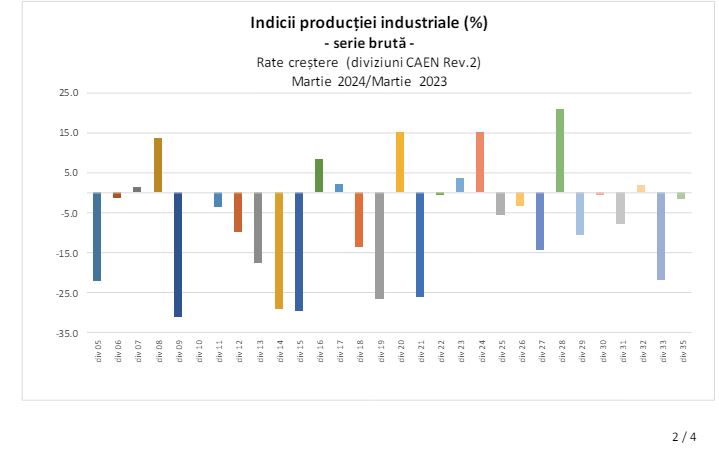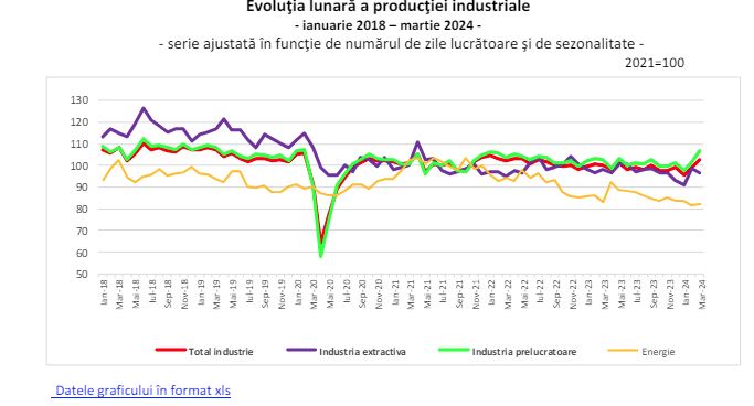 În martie 2024, producţia industrială (serie brută) a crescut faţă de luna precedentă cu 8,1%, ca efect al creşterilor industriei prelucrătoare (+9,3%) şi industriei extractive (+8%).