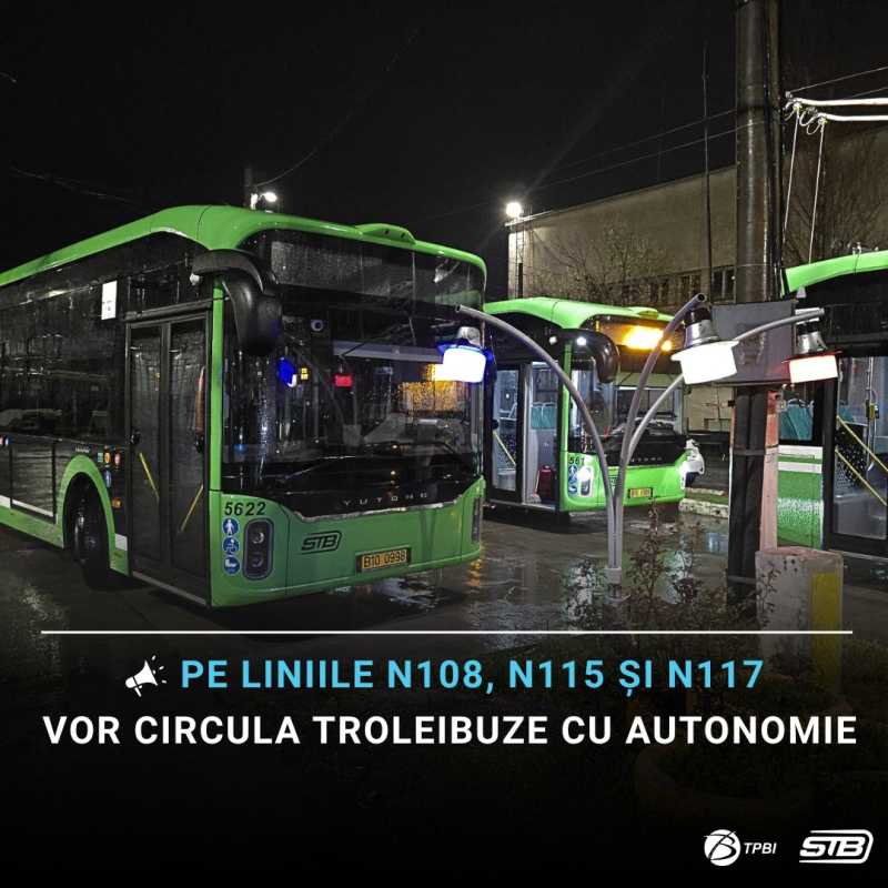TPBI: Pe liniile N108, N115 și N117 vor circula troleibuze cu autonomie