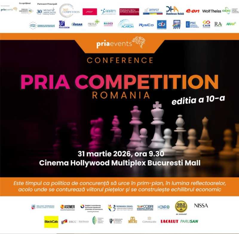 O nouă ediție a conferinței Pria Competition, pe teme de concurență, va avea loc marți la București, eveniment la care sunt așteptați reprezentanți ai autorităților competente, dar și din partea patronatelor, asociațiilor de profil și companiilor. Potrivit organizatorilor, printre cei care au confirmat participarea la conferință se află: Bogdan Chirițoiu - pre