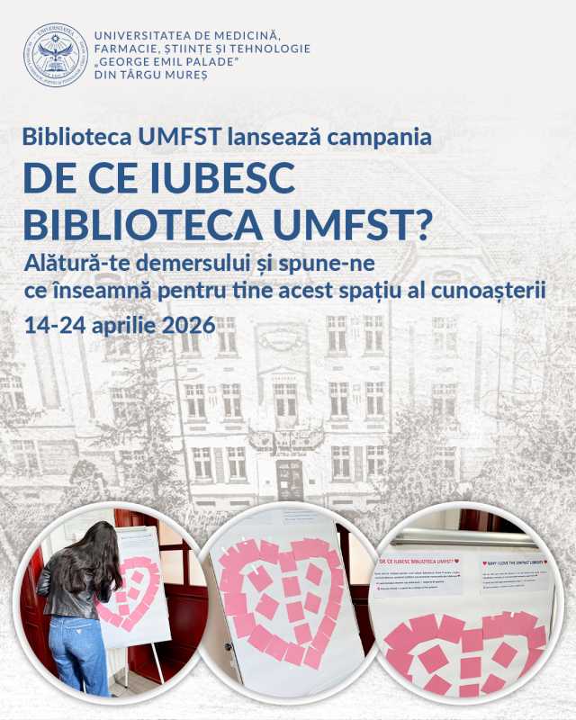 Biblioteca Universității de Medicină, Farmacie, Științe și Tehnologie 'George Emil Palade' (UMFST) din Târgu Mureș a lansat, marți, campania 'De ce iubesc biblioteca UMFST?', în care invite cititorii să transmită mesaje autentice și inspiraționale. 'Biblioteca UMFST derulează, în perioada 14-24 aprilie 202