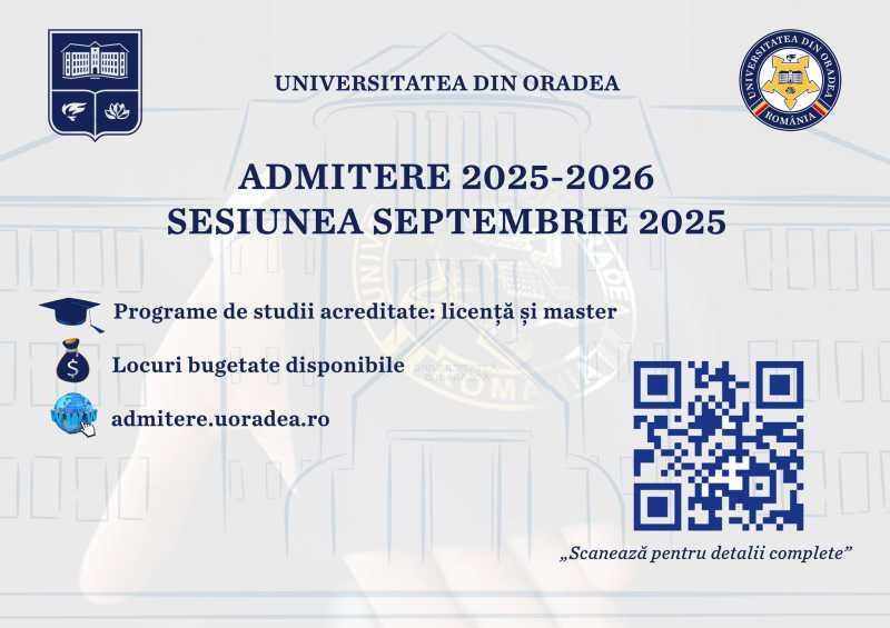 Universitatea din Oradea a anunțat că, la sesiunea de admitere de toamnă, ce va începe de luni, 1 septembrie, la cele 15 facultăți mai sunt disponibile aproape 300 de locuri bugetate la licență și 82 de locuri bugetate la master, precum și multe altele la forma de învățământ cu taxă. Ultima etapă de înscrieri pentru anu
