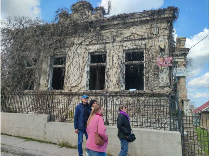 The route through the Greek neighborhood continued past restored and deteriorating heritage buildings, including the Lichiardopol House, damaged by a nearby block built in the 2010s. Dan recalled how, during communist systematization, architects sometimes invented stories to save historic houses: 'The same trick was used here.'