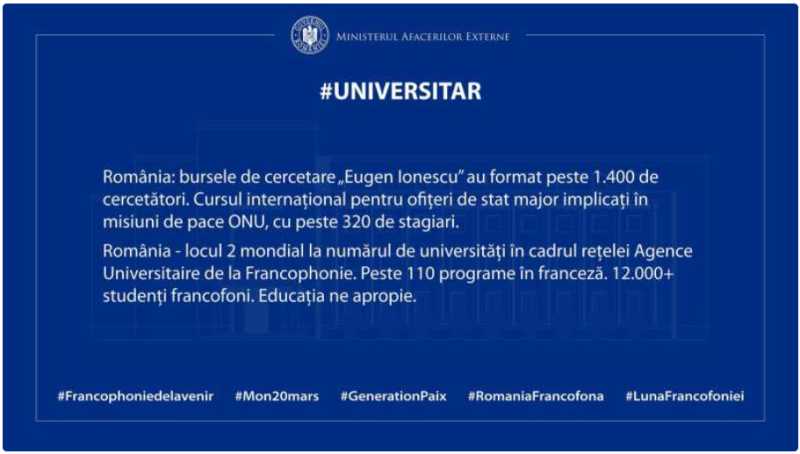 Romania has an active profile in the field of academic and scientific Francophonie, ranking second worldwide in terms of the number of universities affiliated with the University Agency of Francophonie, with about 110 university programs taught in French. The Ministry of Foreign Affairs (MAE) makes these clarifications in the context of the celebration of the