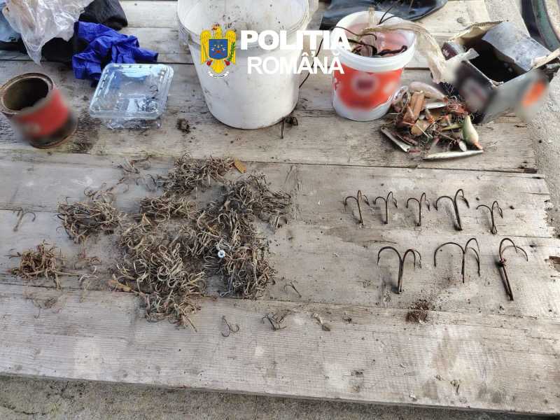 'Cu ocazia perchezițiilor, la locuințele persoanelor bănuite au fost găsite peste 350 de ancore cu ghiară triplă, 8 setci, 6 pripoane, o barcă pneumatică cu motor, o armă cu aer comprimat supusă autorizării, 11 cartușe nepercutate calibrul 16 mm și pese 10 kilograme de pește, din specia somn și șalău, toate fiind ridicate în vederea continuării cercetărilor', a transmis IPJ Arad.