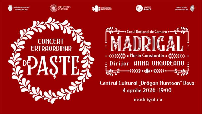 Corul Național de Cameră 'Madrigal - Marin Constantin', dirijat de Anna Ungureanu, va susține, sâmbătă, un concert extraordinar de Paște, la Sala Mare a Centrului Cultural din Deva. 'Corul Madrigal invită publicul spectator într-o călătorie sonoră sacră pentru a întâmpina sărbătorile pascale. Concertul ilustrează muzical Săp
