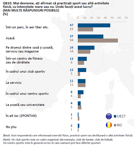 Deși activitatea fizică în aer liber este cea mai sănătoasă formă de mișcare, 58% dintre românii care practică o activitate fizică fac acest lucru acasă și doar 22% într-un parc sau aer liber. Procentul la nivelul UE al celor care exersează în parcuri sau aer liber este de peste două ori mai mare, 47%, și doar 37% fac mișcare acasă și 35% într-un centru de fitness, club sportiv sau centru sportiv. Partea bună este că românii au făcut mai multă mișcare în aer liber în 2022 față de 2017, când doar 17% făceau o activitate fizică în aer liber. Acest lucru este vizibil, după pandemie înmulțindu-se considerabil numărul celor care fac sport în parcuri, de la cursuri de arte marțiale, yoga sau tai chi, până la jogging sau sporturi de echipa (baschet, volei).