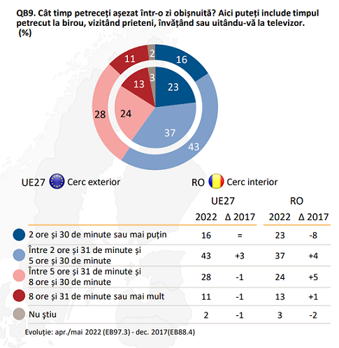 62% dintre români nu practică niciun sport sau o activitate fizica, conform sondajului Eurobarometru dedicat sportului și activității fizice, publicat de Comisia Europeană în 2022. La nivel european, doar 45% dintre persoanele chestionate declară că nu fac nicio activitate fizica, iar 11% dintre europeni și 13% dintre români stau pe scaun peste 8.5 ore pe zi.