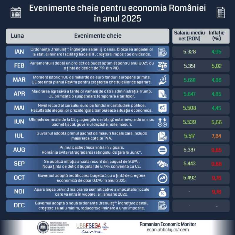 Pentru a înțelegere mai clară a dinamicii economiei României în 2025, echipa de cercetare RoEM-UBB FSEGA a trecut în revistă cele mai importante evenimente economice ale fiecărei luni:
