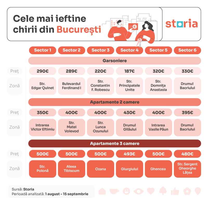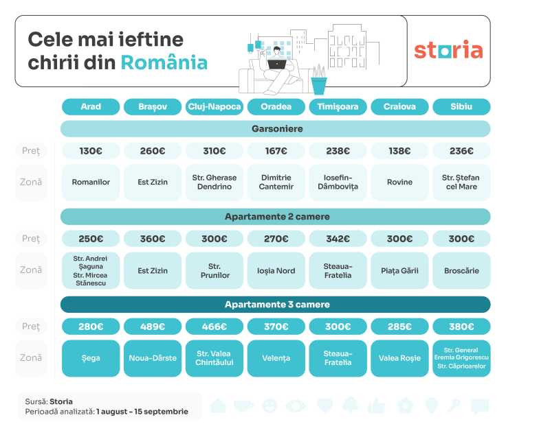 Cele mai ieftine chirii din ultima perioadă pornesc de la 130 de euro pentru o garsonieră în cartierul Romanilor din Arad și 138 de euro în cartierul Rovine din Craiova. La polul opus, în Cluj-Napoca, chiar și cele mai ieftine zone, precum Strada Gherase Dendrino, au chirii de la 310 euro, iar în București prețurile minime încep de la 187 de euro pe Strada Principatele Unite (Sectorul 4). Analiza a fost realizată de Storia, cea mai vizitată platformă imobiliară din România, pe baza anunțurilor de închiriere active pe platformă în perioada 1 august – 15 septembrie 2025, din principalele orașe din țară: București, Arad, Braşov, Cluj-Napoca, Oradea, Timişoara, Craiova și Sibiu.
