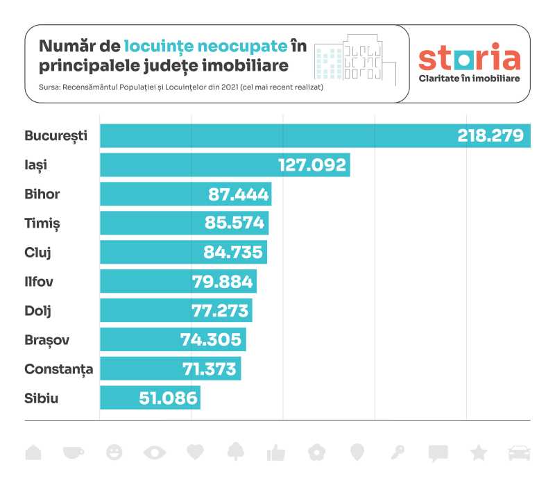 În România există peste 2,5 milioane de locuințe nelocuite, dintre care peste 218.000 se află în București, iar alte 62.000 sunt în orașele din județul Iași. Numărul locuințelor neocupate depășește 50.000 de unități și în mediul urban din județele Constanța, Brașov și Timiș.