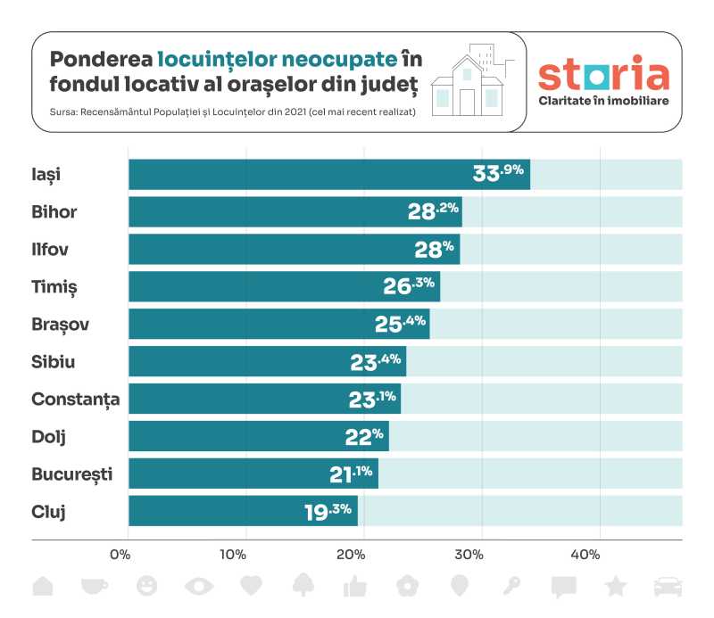 - Iași și Bihor înregistrează cele mai ridicate ponderi ale locuințelor neocupate în orașe, cu 33,9%, respectiv 28,2%