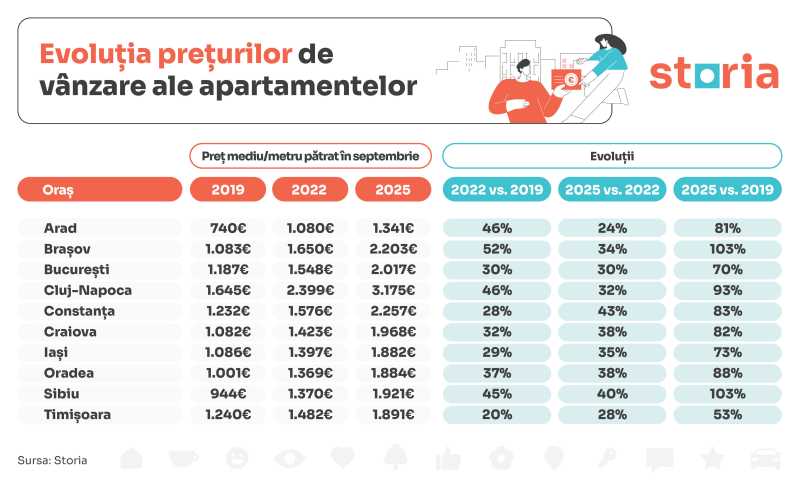 Un sfert dintre locuințele din România erau nelocuite în anul 2021, o pondere semnificativă mai ales dacă ne raportăm la evoluția prețurilor la locuințe din marile orașe ale României. De altfel, o analiză recentă realizată de Storia a scos în evidență că prețul mediu al unei locuințe din București a crescut cu 70% din 2019 până în 2025, la aproximativ 2.000 euro pe metru pătrat.