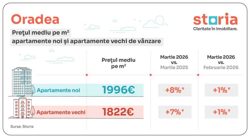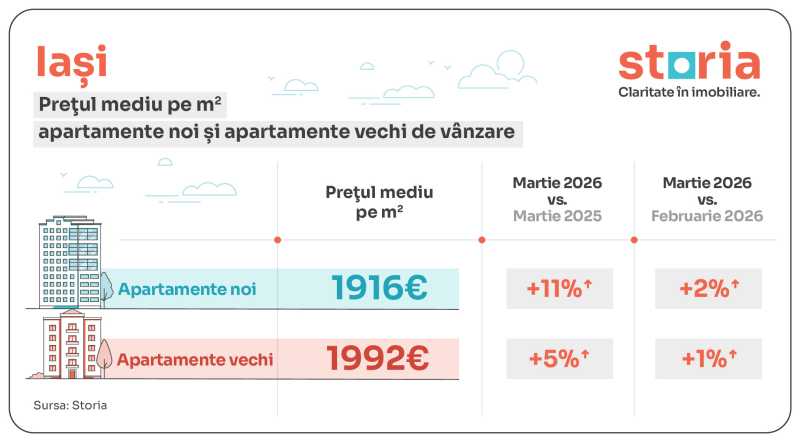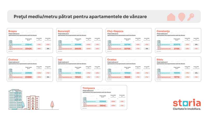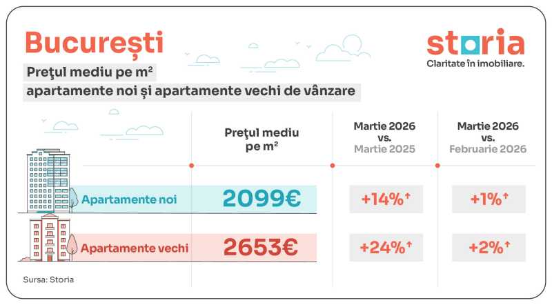 În martie 2026, București a înregistrat cel mai mare decalaj între prețurile solicitate pentru apartamente vechi și noi. Astfel, prețul mediu solicitat pentru apartamentele vechi a fost de 2.653 euro/mp, cu 27% mai mare decât prețul mediu de 2.099 euro/mp pentru apartamentele noi. Prețurile pentru apartamentele vechi au fost mai mari decât cele pentru apartamentele noi și în Iași (+4%), Constanța (0,9%) și Sibiu (0,6%).
