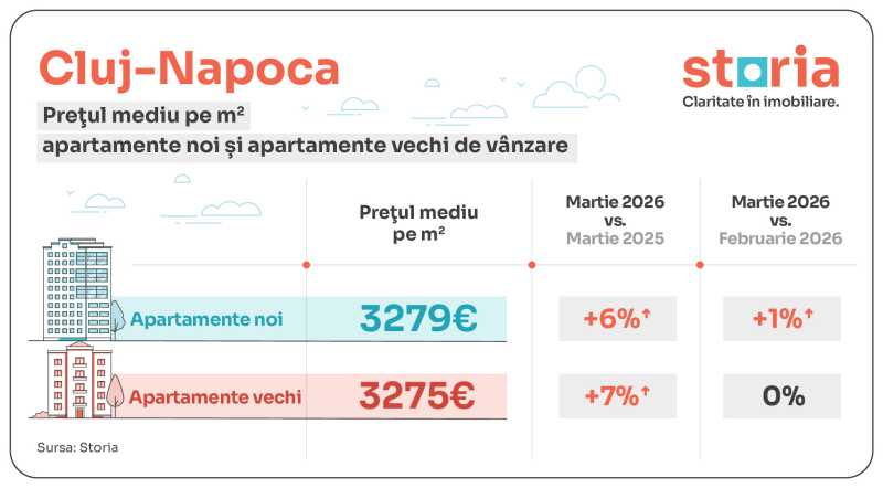 La fel ca Brașov, Cluj-Napoca se remarcă prin diferențe neglijabile între locuințele noi și cele vechi. În martie 2026, prețul pentru locuințele noi a crescut cu 6%, la 3.279 euro/mp, în timp ce locuințele vechi costau 3.275 euro/mp, cu 7% mai mult decât în luna martie a anului trecut.