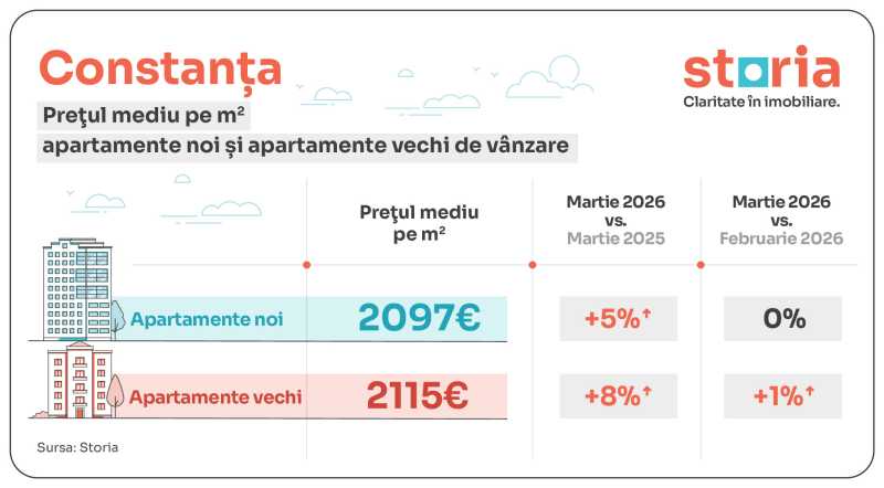 În orașul Constanța, prețurile solicitate pentru locuințele noi au crescut cu 5% în martie 2026 comparativ cu martie 2025, la 2.097 euro/mp, în timp ce locuințele vechi au devenit mai scumpe cu 8%, la o medie de 2.115 euro/mp.