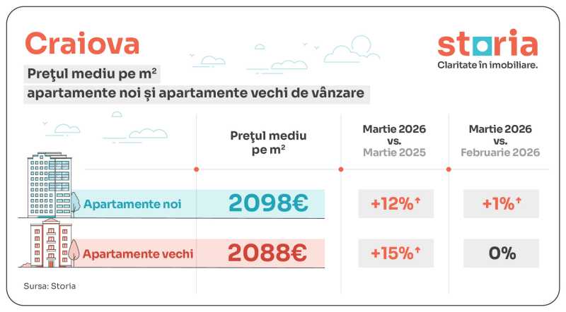 Pe de o parte, dintre marile orașe ale României, cele mai mari creșteri procentuale ale prețurilor medii la apartamente în martie 2026 comparativ cu luna similară a anului trecut s-au înregistrat în București (2.402 euro/mp, +22%), Craiova (2.090 euro/mp, +15%) și Timișoara (1.978 euro/mp, +11%). Prețurile menționate au fost calculate luând în considerare atât apartamentele noi, cât și apartamentele vechi.