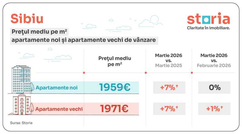 La Sibiu, numărul de tranzacții a crescut cu 6,5% față de martie 2025 și cu 25% comparativ cu februarie 2026, iar datele indică faptul că, pe parcursul ultimului an, locuințele noi au devenit mai scumpe decât locuințele vechi.