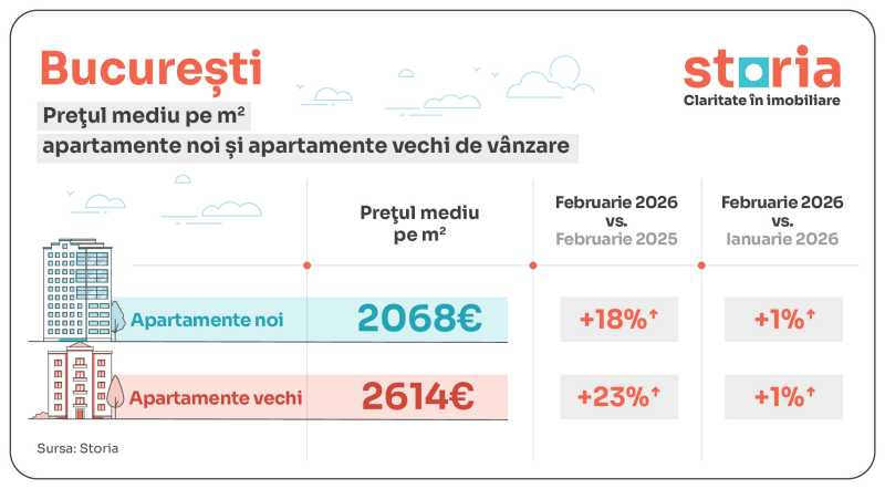 Capitala continuă să înregistreze cele mai mari diferențe între apartamentele vechi și cele noi. În februarie 2026, prețul mediu solicitat a fost de 2.068 euro/mp pentru apartamentele noi, cu 18% mai mult față de februarie 2025 și cu 1% peste nivelul din ianuarie 2026, respectiv de 2.614 euro/mp pentru apartamentele vechi, în creștere cu 23% de la un an la altul și cu 1% față de luna anterioară.