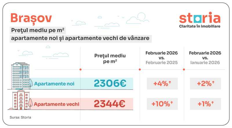 În Brașov, prețul mediu solicitat în februarie 2026 a fost de 2.306 euro/mp pentru apartamentele noi, cu 4% mai mult față de februarie 2025 și cu 2% peste nivelul din ianuarie, în timp ce apartamentele vechi au avut un preț mediu de 2.344 euro/mp, în creștere cu 10% de la un an la altul și cu 1% față de luna anterioară. Diferențele dintre cele două segmente rămân reduse.