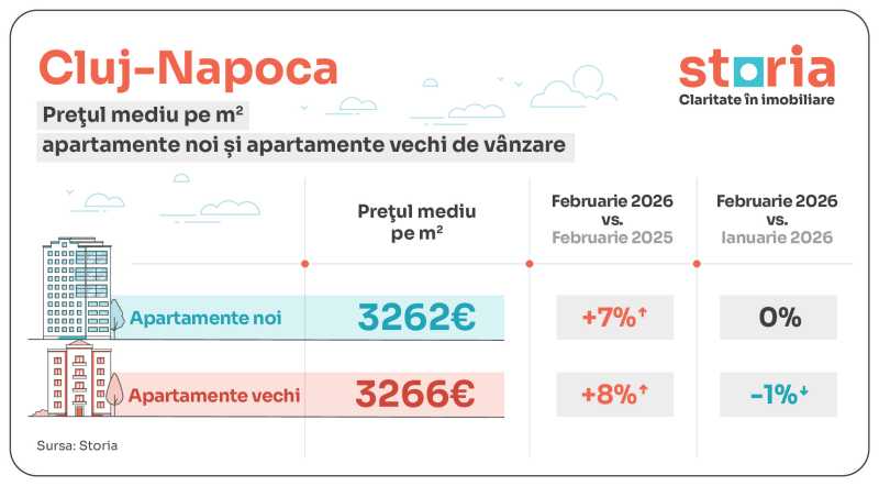 Prețurile apartamentelor din marile orașe ale României – luând în calcul atât locuințele noi, cât și pe cele vechi – au înregistrat o creștere medie de 16% în februarie 2026 comparativ cu aceeași perioadă a anului trecut. Datele sunt bazate pe analiza prețurilor medii solicitate în anunțurile publicate pe Storia – cea mai vizitată platformă imobiliară din România. Cluj-Napoca rămâne cel mai scump oraș din țară, dar cu un preț mediu ușor mai mic decât în luna ianuarie, de 3.264 euro/mp, urmat de București, cu o medie de 2.373 euro/mp și Brașov (2.336 euro/mp).