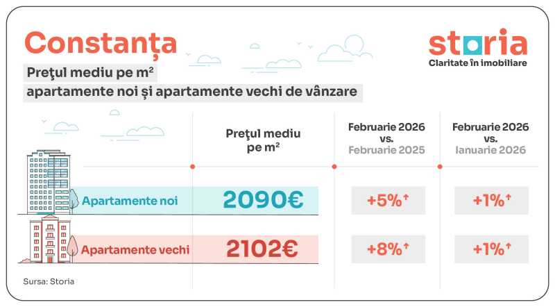 În Constanța, prețul mediu solicitat în februarie 2026 a fost de 2.090 euro/mp pentru apartamentele noi, cu 5% mai mult față de februarie 2025 și cu 1% peste nivelul din ianuarie, în timp ce apartamentele vechi au ajuns la 2.102 euro/mp, în creștere cu 8% de la un an la altul și cu 1% față de luna anterioară.