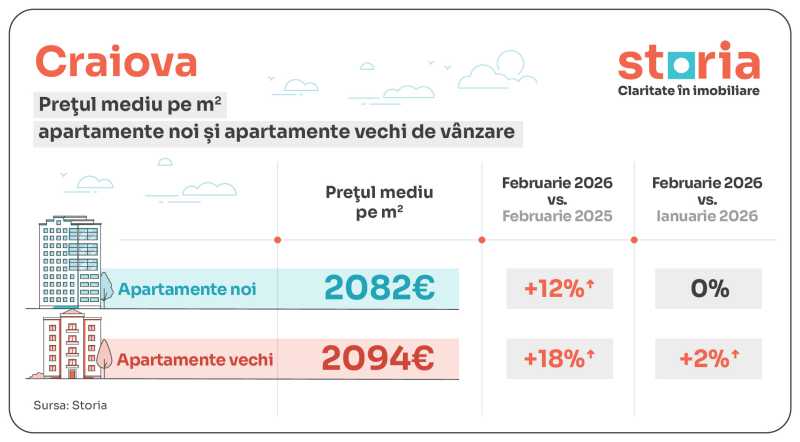În Craiova, apartamentele noi au avut în februarie 2026 un preț mediu de 2.082 euro/mp, cu 12% mai mult față de februarie 2025 și la un nivel similar cu luna anterioară, în timp ce apartamentele vechi au ajuns la 2.094 euro/mp, în creștere cu 18% de la un an la altul și cu 2% față de ianuarie 2026.