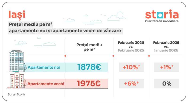 În Iași, prețul mediu solicitat în februarie 2026 a fost de 1.878 euro/mp pentru apartamentele noi, cu 10% mai mult față de februarie 2025 și cu 1% peste nivelul din ianuarie, în timp ce apartamentele vechi au ajuns la 1.975 euro/mp, în creștere cu 6% de la un an la altul și similare față de luna anterioară.