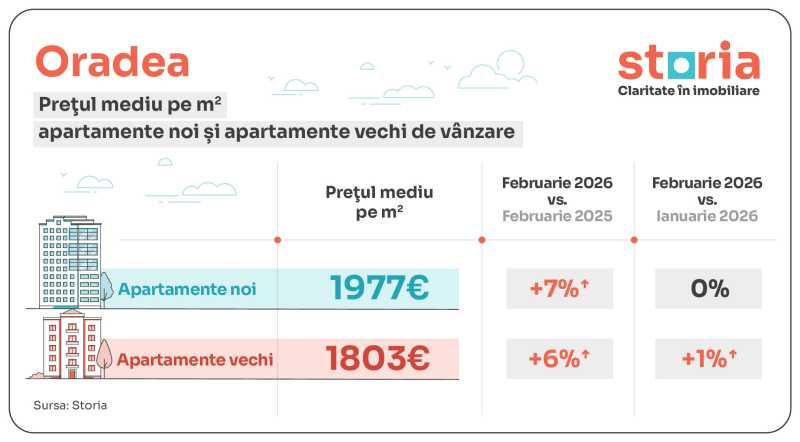 În Oradea, apartamentele noi au avut în februarie 2026 un preț mediu de 1.977 euro/mp, cu 7% mai mult față de februarie 2025 și la un nivel similar cu luna anterioară, iar cele vechi 1.803 euro/mp, în creștere cu 6% de la un an la altul și cu 1% față de ianuarie 2026.