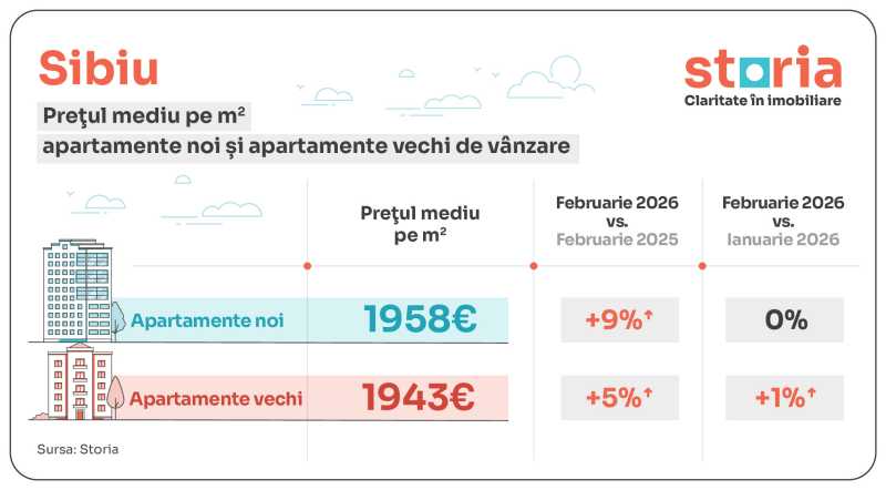 În Sibiu, prețul mediu solicitat în februarie 2026 a fost de 1.958 euro/mp pentru apartamentele noi, cu 9% mai mult față de februarie 2025 și la un nivel similar cu cel din ianuarie, în timp ce apartamentele vechi au ajuns la 1.943 euro/mp, în creștere cu 5% de la un an la altul și cu 1% față de luna anterioară.