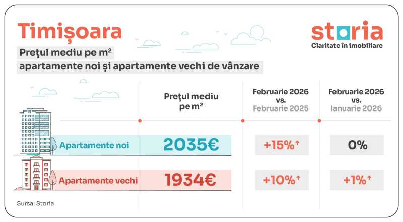 În Timișoara, apartamentele noi au avut în februarie 2026 un preț mediu de 2.035 euro/mp, cu 15% mai mult față de februarie 2025 și la un nivel similar cu luna anterioară, iar cele vechi 1.934 euro/mp, în creștere cu 10% de la un an la altul și cu 1% față de ianuarie 2026.
