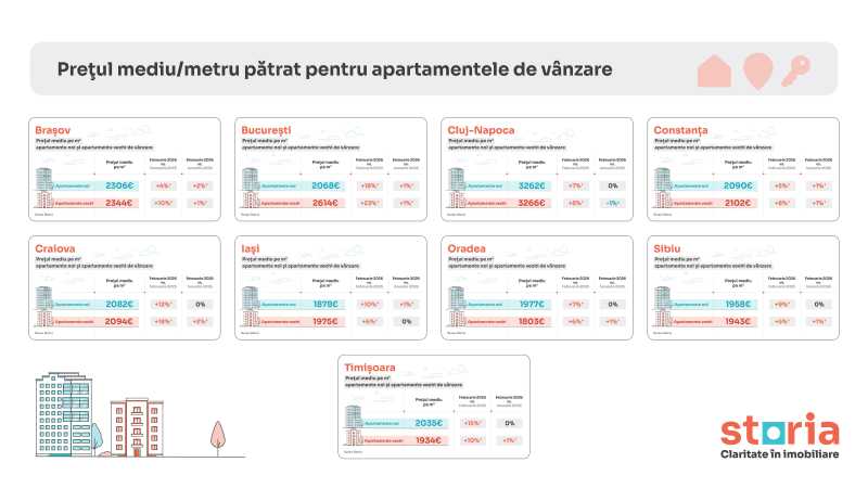 Analiza Storia arată că, în februarie 2026, piața rezidențială din România rămâne activă, cu creșteri vizibile de la un an la altul în majoritatea marilor orașe, în special în București, Craiova și Timișoara, dar și cu diferențe tot mai vizibile între apartamentele noi și cele vechi.