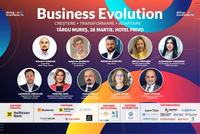 Doingbusiness.ro continuă seria de evenimente Business Evolution – Creștere. Transformare. Adaptare, un roadshow dedicat antreprenorilor și managerilor care caută soluții practice pentru dezvoltarea afacerilor într-un context economic aflat în continuă schimbare. Cea de-a treia ediție din 2026 va avea loc pe 26 martie, la Hotel Privo din Târgu Mureș.