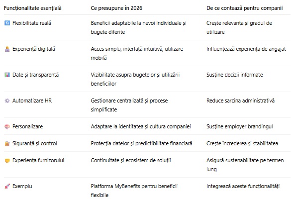 În continuare, sunt analizate funcționalitățile esențiale care definesc o soluție de beneficii flexibile pregătită pentru 2026.