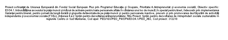 Asociația Exino, în parteneriat cu Dast Training System SRL, anunță finalizarea etapei de furnizare de servicii personalizate de consiliere /consultanță/ mentorat și de asigurare a înființării și demarării funcționării întreprinderilor ce vor implementa planurile de afaceri cu ajutor de minimis în cadrul proiectului „Sprijin pentru dezvoltarea de întreprinderi sociale sustenabile în regiunile Centru și Sud Muntenia”, cod MySMIS 312218, cofinanțat din Fondul Social European Plus prin Programul Educație și Ocupare 2021–2027.