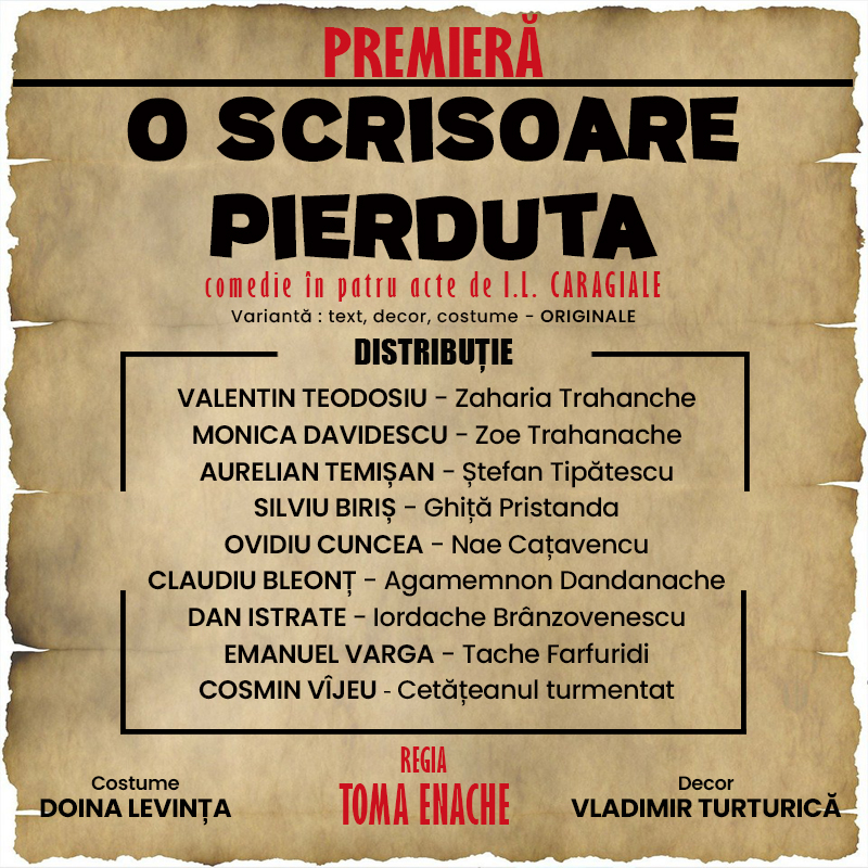 Pe 18 noiembrie, publicul bucureștean este invitat să redescopere magia comediei românești prin spectacolul „O scrisoare pierdută”, o montare fidelă spiritului original al lui I.L. Caragiale.