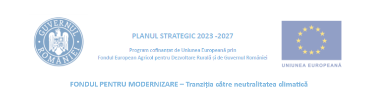 Acest proiect a obținut finanțare în cadrul Planului Strategic 2023 – 2027 (PS 2023 - 2027), FONDUL PENTRU MODERNIZARE – Tranzitia catre neutralitate climatica, Schema de ajutor privind sprijinirea investițiilor în noi capacități de producere a energiei electrice produsă din surse regenerabile pentru autoconsumul întreprinderilor din cadrul sectorului agricol și industriei alimentare.
