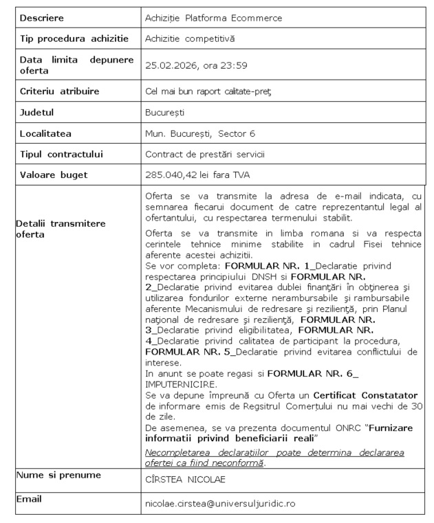 ANUNȚ DEMARARE ACHIZIȚIE COMPETITIVĂ Nr. 1