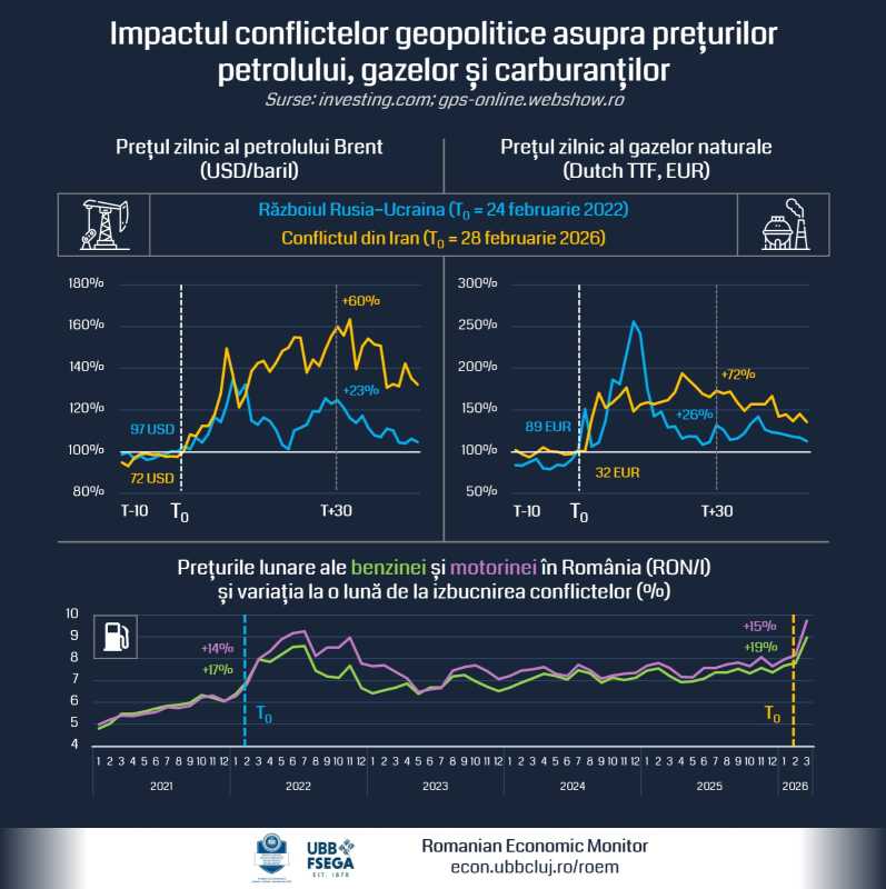 CLUJ-NAPOCA, 20 aprilie 2026: Prelungirea conflictului din Iran și riscurile asociate pentru aprovizionarea globală cu petrol generează efecte tot mai vizibile asupra economiilor europene, inclusiv asupra celei românești. Scumpirea petrolului nu înseamnă doar facturi mai mari la energie, ci poate frâna întreaga economie, printr-un efect în lanț care pornește de la reducerea consumului și ajunge până la amânarea investițiilor, arată analiza realizată de specialiștii Romanian Economic Monitor (RoEM)-UBB FSEGA, proiect de cercetare al Facultății de Științe Economice și Gestiunea Afacerilor (FSEGA) din cadrul Universității Babeș-Bolyai (UBB) din Cluj-Napoca.