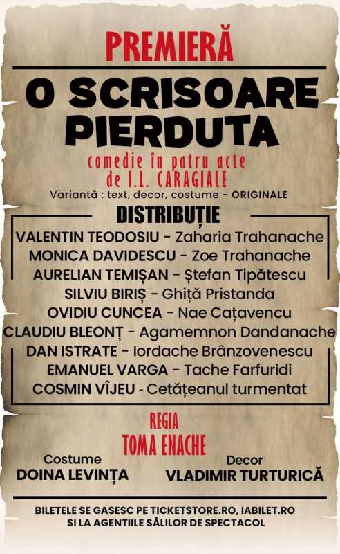 Piatra de temelie a comediei românești, „O scrisoare pierdută” de I.L. Caragiale, renaște într-o montare care respectă cu sfințenie spiritul original al capodoperei. Această premieră nu aduce modernizări sau reinterpretări contemporane, ci păstrează decorurile, costumele și atmosfera cu noblețea și autenticitatea ce au fascinat generații întregi de spectatori.