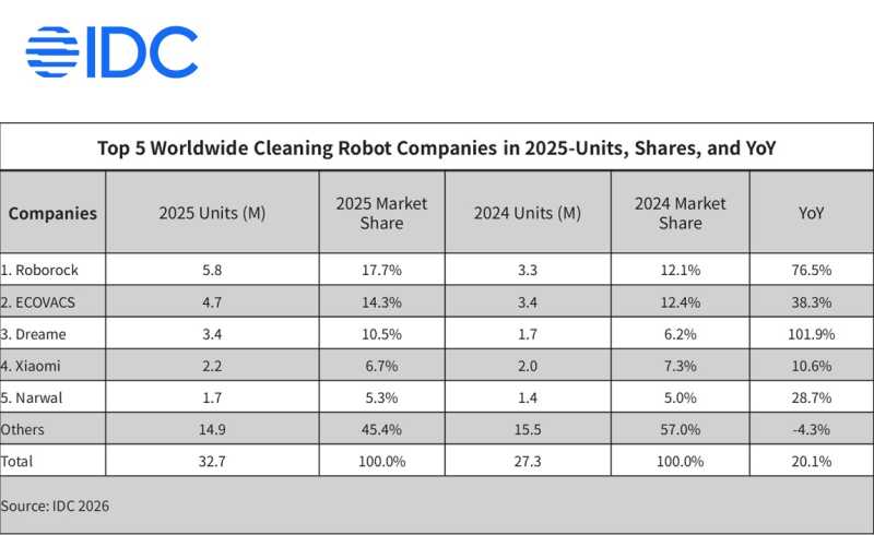 Rezultatul vine pe fondul creșterii întregii piețe de robotică pentru curățenia locuinței. Conform IDC, livrările globale au atins 32,72 milioane de unități în 2025, în creștere cu 20,1% față de anul precedent.