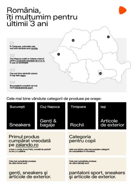Cu ocazia aniversării a trei ani de la lansarea pe piața din România, Zalando – platforma europeană multi-brand de modă și lifestyle – a analizat preferințele locale de cumpărare pentru îmbrăcăminte și încălțăminte. Conform datelor din ultimii trei ani, românii fac alegeri clare în materie de stil, cu accent pe articolele de tip streetwear și cele pentru copii. În ceea ce priveşte categoria streetwear, cererea ridicată pentru sneakers a avut un impact major. Datele evidențiază și diferențe regionale notabile și subliniază apetitul românilor pentru shopping multi-brand, calitate și un bun raport calitate-preț.