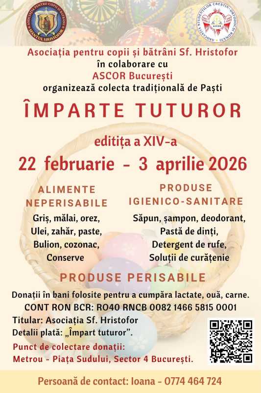 Titlu: „Împart tuturor” – ediția a XIV-a a colectei tradiționale de Paști aduce speranță pentru sute de persoane vulnerabile din București și Ilfov Într-o perioadă în care se află dificultățile economice și sociale afectează toate mai multe familii, inițiativele de solidaritat