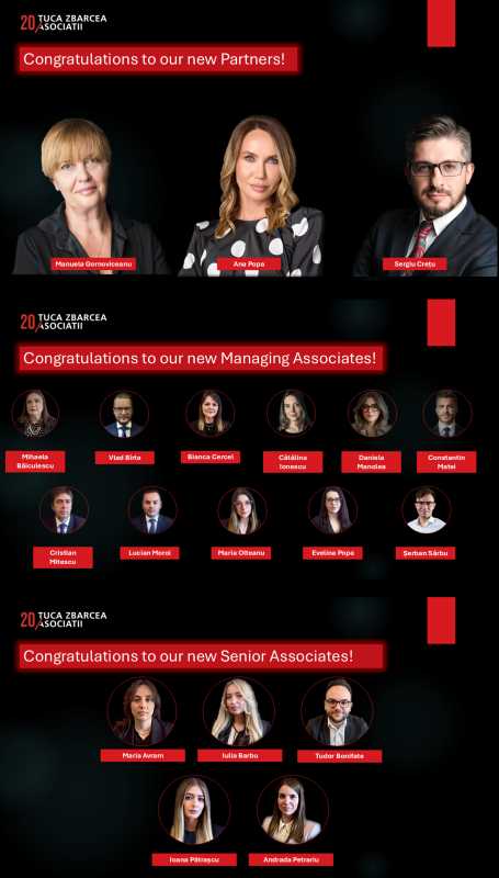 Țuca Zbârcea & Asociații își extinde echipa de management: Manuela Gornoviceanu, Ana Popa și Sergiu Crețu devin Parteneri. De asemenea, alți 16 avocați au făcut un pas înainte în carieră. Aceste promovări sunt parte a strategiei Țuca Zbârcea & Asociații de consolidare a echipei, reflectând recunoașterea meritelor individuale și a contribuției fiecărui avocat la succesul firmei. Țuca Zbârcea & Asociații anunță una dintre cele mai extinse runde de promovări interne din istoria firmei. Astfel, urmare a sesiunii de evaluare profesională din acest an, 19 avocați vor avansa în carieră începând cu data de 1 ianuarie 2026.