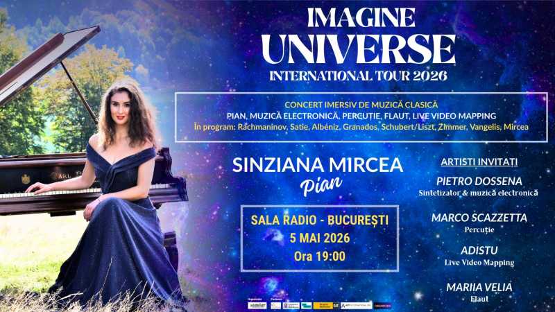 Pian, percutii, flaut, muzica electronica si live video mapping se vor reuni intr-o noua serie de concerte imersive de muzica clasica in cadrul „IMAGINE Universe” TOUR 2026, sub semnatura inconfundabila a pianistei si compozitoarei romane Sinziana Mircea, solista seriei de concerte. Recunoscuta pentru proiectele sale inovatoare, pianista aduce pe scena si de aceasta data atat repertorii de referinta ale muzicii clasice pentru pian solo, compozitii proprii, cat si combinatii neobisnuite de instrumente ce sustin dialoguri intre muzica clasica si muzica electronica. Aceasta abordare interdisciplinara a devenit emblema seriei IMAGINE, initiata in 2019 si ajunsa la a sasea editie.