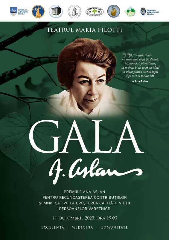 'Fundația Ana Aslan, în parteneriat cu Primăria Municipiului Brăila, are plăcerea de a anunța desfășurarea Galei Ana Aslan 2025, aflată la a doua ediție. Evenimentul de prestigiu este dedicat recunoașterii contribuțiilor semnificative în domeniul studierii fenomenului de îmbătrânire și al îmbunătățirii calității vieții persoanelor mature și vârstnice', se arată într-un comunicat de presă transmis, joi, de Fundația Ana Aslan.